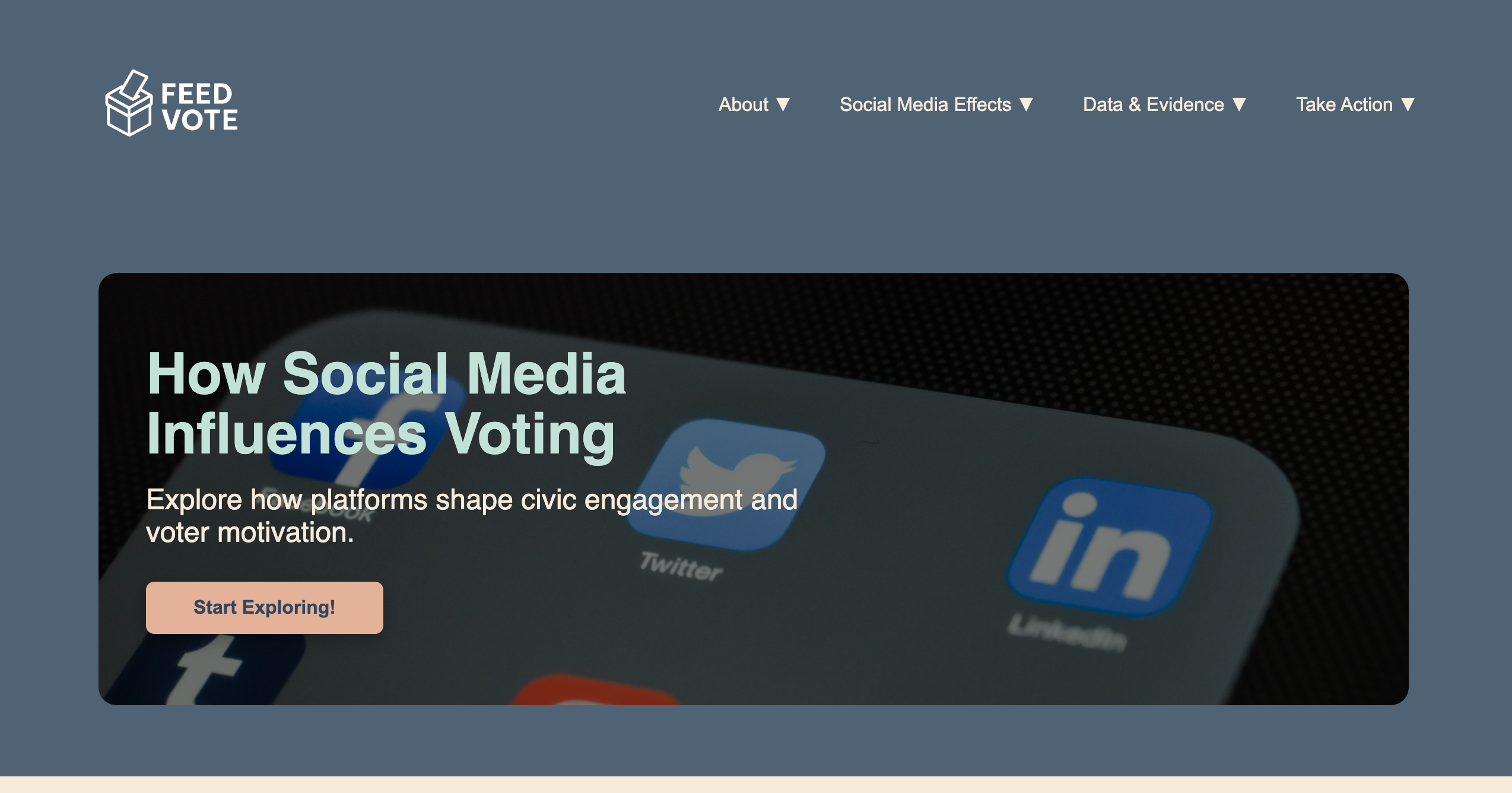 FeedToVote began as a research-based school project exploring how social media feeds influence civic engagement and voter motivation. After completing extensive research and writing a formal paper on the topic, the final requirement was to present the findings in a clear, public-facing format. I chose to turn it into a fully designed website. I built the site with a clean, modern UI and a mobile-first layout, focusing on readability, structure, and performance so the research could be explored like a real product rather than a static assignment.